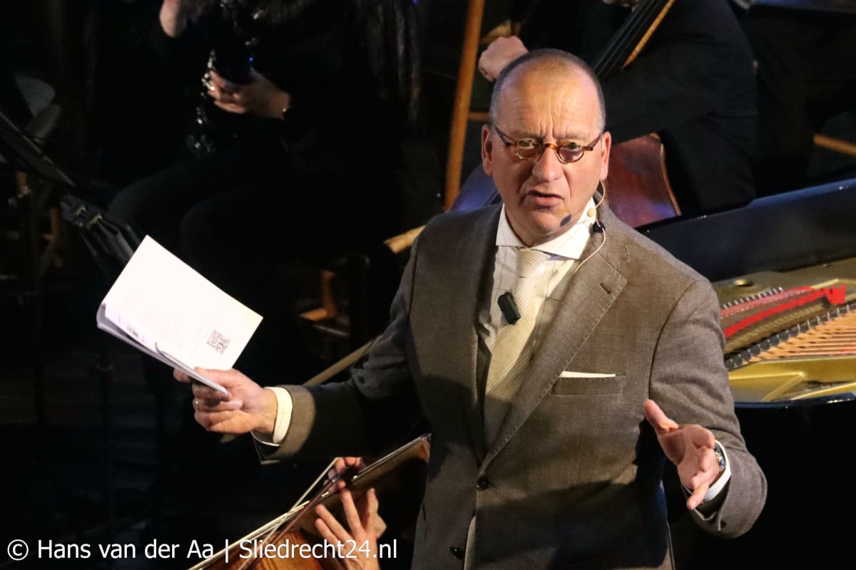 De bezoekers werden hartelijk welkom geheten door Theo Segers, gastpresentator van de avond (zie foto hieronder). Segers – in het dagelijks leven burgemeester van Gemeente Molenlanden – treedt regelmatig op als gastspreker bij verschillende maatschappelijke en bestuurlijke bijeenkomsten. Hij gaf op zijn karakteristieke wijze een toelichting bij de drie uitgevoerde werken.