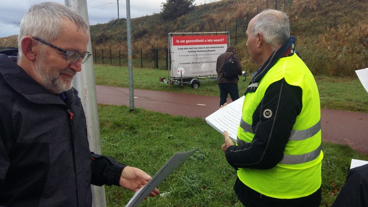 15. Nou ik was erbij en ik moet toegeven alle complimenten voor … De gastheer. Dankzij de organisatie van Chemours en Dupont werd het niet een al te grote zielige vertoning. De bedrijven hadden gezorgd voor een podium, geluid en koeken met koffie, gratis dus dit werd gretig afgenomen Door de aanwezigen. Hoewel ik wel mensen hoorde klagen dat ze de koeken oud vonden en of er geen APFO in de koffie zat. Zo voorspelbaar…….. zelfs voor toilet bezoek kon je terecht.