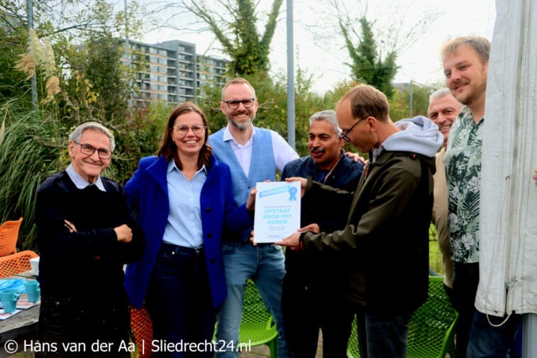 De Sociale Moestuin Sliedrecht kreeg uit handen van Mirjam Bikker een oorkonde (opschrift: ‘Uitgeroepen tot organisatie die opkomt voor het goede’) uitgereikt. Van links naar rechts: Arie de Ruiter (bestuursadviseur Sociale Moestuin), Mirjam Bikker (lijsttrekker ChristenUnie), Jan Pieter Verweij (plaatselijk gemeenteraadslid SGP-ChristenUnie, tevens regiokandidaat Tweede Kamerverkiezing ChristenUnie) en enkele vrijwilligers van de Moestuin. (Foto Hans van der Aa / Sliedrecht24)