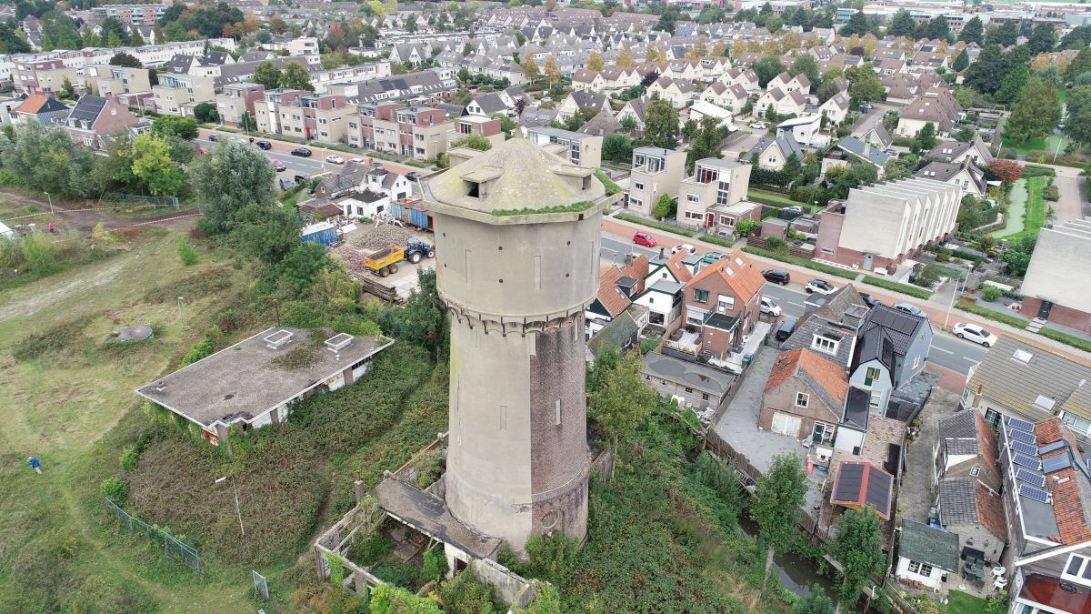 Een luchtfoto van het watertorenterrein. Watertoren B.V. vroeg al op 21 december 2023 voor het plan een vergunning aan. Wethouder Ton Spek (CDA) van Wonen: “De ondertekening is een belangrijke stap op weg naar de herontwikkeling van dit terrein. We werken nu samen met de initiatiefnemer toe naar besluitvorming in 2026.” (© Archieffoto RPAS Peter Donk / Dronetv.nl)