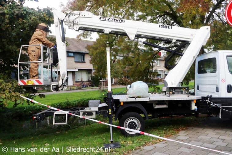 SLIEDRECHT – Met het vallen van het blad worden nesten van Aziatische hoornaars zichtbaar. Gemeente Sliedrecht heeft een gespecialiseerd bedrijf ingehuurd om deze te verwijderen. Donderdag 30 oktober 2025 is een aantal van deze nesten uit toppen van bomen verwijderd. Onder andere in de Rijnstraat en de Merelstraat. In de afgelopen week zijn op verschillende plaatsen al zes nesten verwijderd.