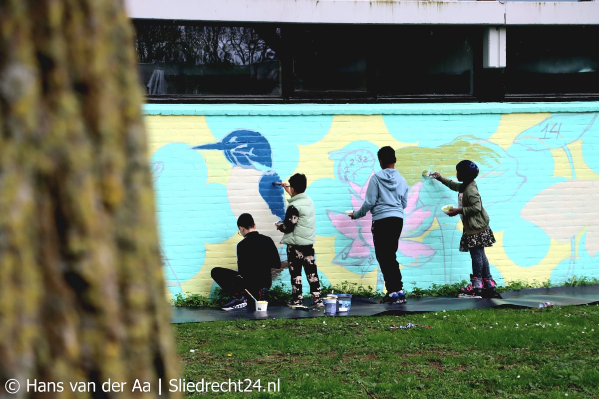 SLIEDRECHT – ‘Samen-werken’ aan een muurschildering met als resultaat een blijvende herinnering. Maandag 20 april 2026 maakten kinderen een start met het schilderen van een street art-kunstwerk aan de achterzijde van de Havikflat. In een project met alle bewoners van de Sperwerflat (80 t/m 160), de Havik en de Valkhof (de tienhoogflats) wordt tot en met vrijdag 24 april 2026 een 70-meterlange muurschildering gemaakt. Iedereen mag van 10.00 tot 17.00 uur meedoen of komen kijken.