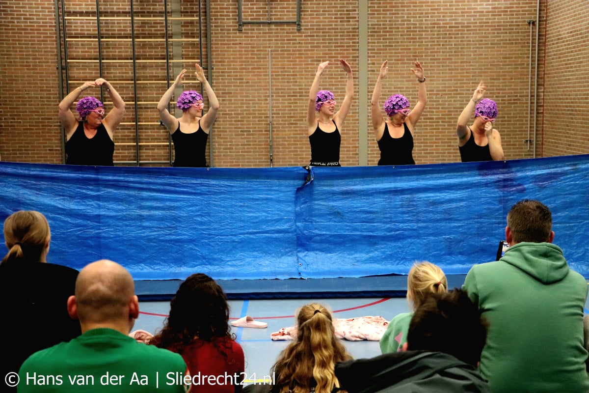 Live entertainment met surprise act was er in de gymzaal. Een spetterende act met ‘De Zeemeerminnetjes’ (zie foto hieronder), vijf dames in badjas met daaronder een badpak en gymnastische oefeningen achter een blauw doek. Hilarisch om te zien. Verder was er de mogelijkheid om je te laten schminken en je nagels te laten lakken. Voor prijzen moest je zijn bij het rad van fortuin. Het was weer groots en aantrekkelijk. Een voorbeeld voor anderen! Volgend jaar vast weer…