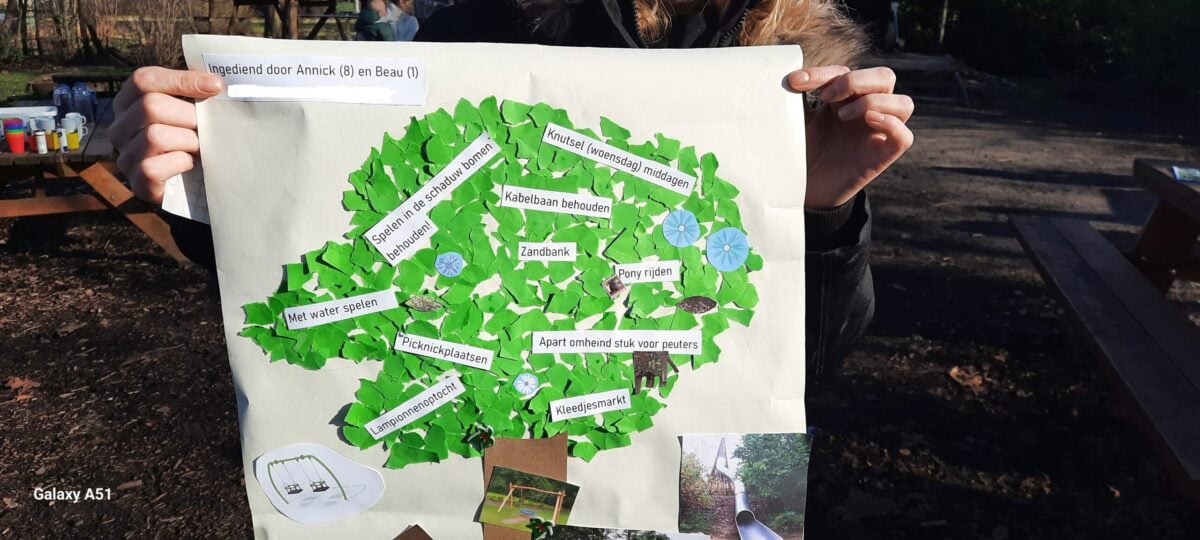Vooraf kregen ze een uitleg (foto hierboven) wat er van hen werd gevraagd. Drie uur lang waren kinderen – waaronder verschillende leden van de kinderraad – moodboards aan het maken, ze praatten met leidinggevenden van het NME-centrum De Hooizolder of met speelruimte-ontwerper Suzanne van Ginneken van Speelnatuur. Met als doel alle ideeën te gaan verzamelen, daar de beste uit te halen en te gaan kijken wat haalbaar is.