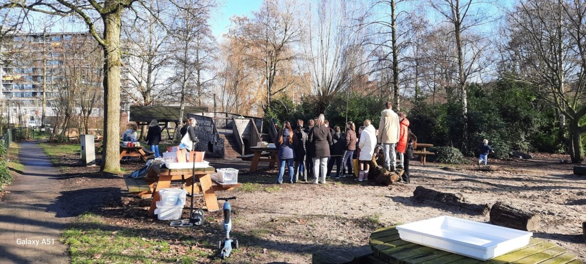 Niet alle kinderen gingen meteen aan de slag. Een aantal ging (spelenderwijs) een rondje natuurspeeltuin doen. Mogelijk om te zien wat ontbreekt, wat er nu is of misschien in hun ogen anders kan. Sommige speelplaatsen in de natuurspeeltuin bestaan al jaren en zijn veelal door volwassenen bedacht en uitgevoerd. Kinderogen kijken naar sommige plaatsen nu anders en kijken naar de tijd van nu.