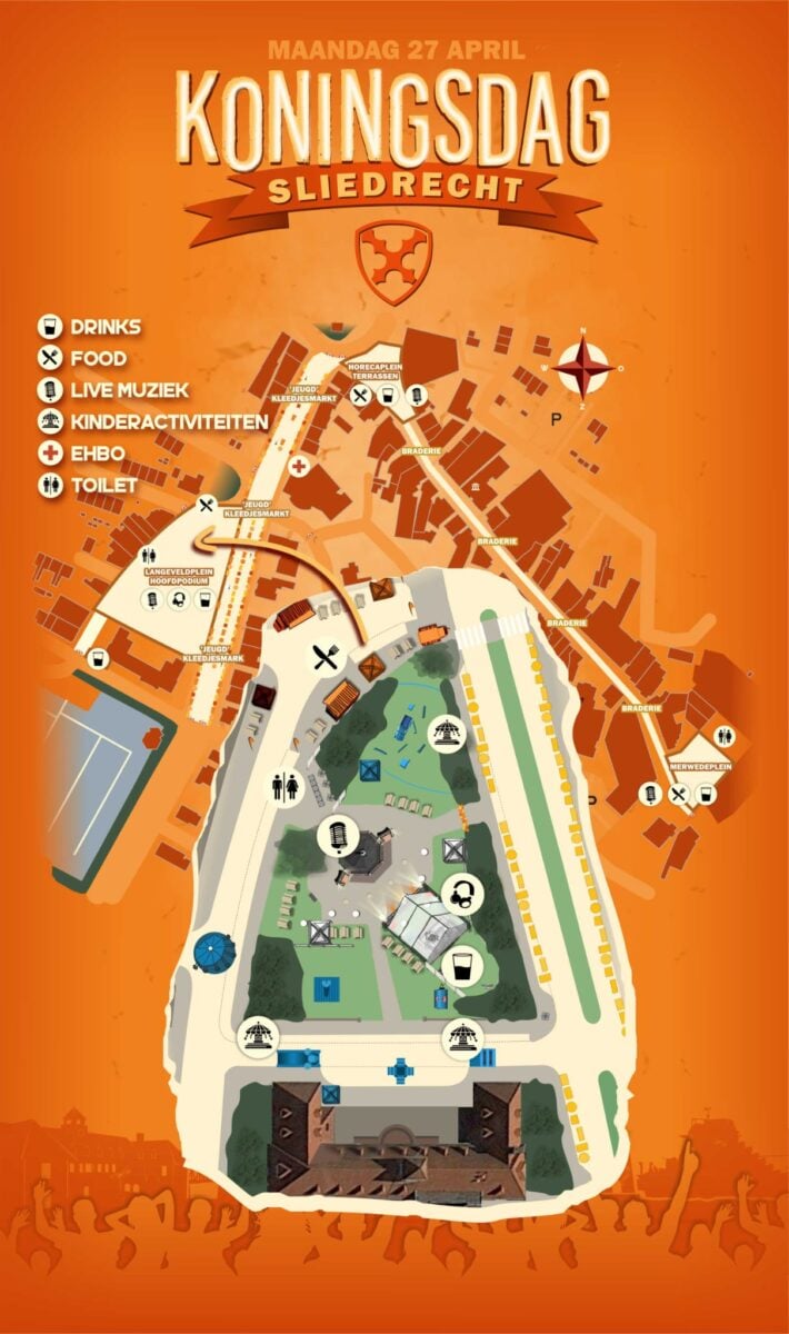 “De opzet is grotendeels net als andere jaren. Het evenemententerrein is niet groter dan de vorige twee edities, maar de opzet wel inclusief winkelpromenade Kerkbuurt en het Merwedeplein. Er is veel meer te doen. Er is weer live-muziek op het horecaplein aan de kop van de Kerkbuurt-Stationsweg. “De braderie is groter dan ooit!”, vertelt secretaris Dennis Speksnijder van OranjeVereniging Sliedrecht. Hij vormt samen met voorzitter Guido van Os, penningmeester Ruben Vlot en bestuurslid veiligheid en facilitaire zaken Dick Booij het bestuur. Jonge mensen die vol enthousiasme aan de slag zijn om er een gezellige dag van te maken.