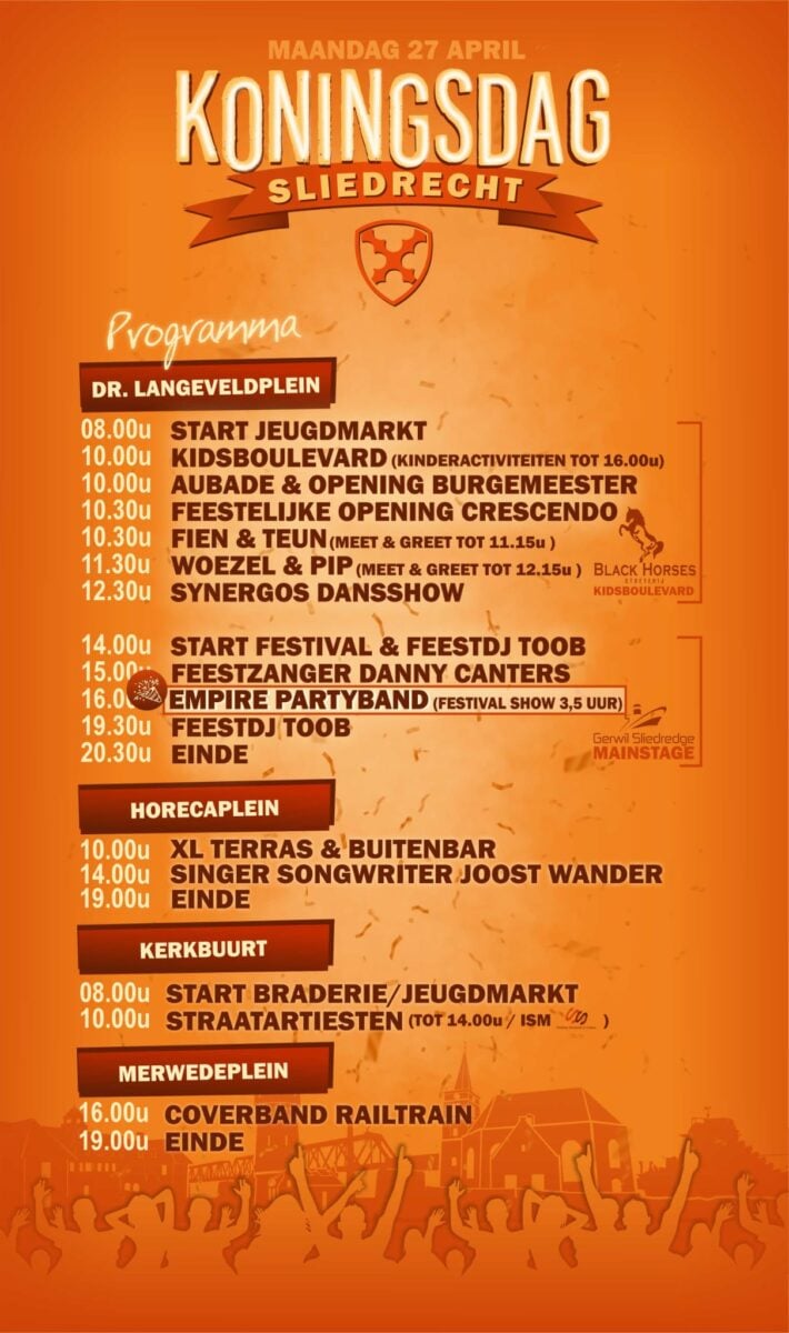 SLIEDRECHT – OranjeVereniging Sliedrecht bereidt de viering van Koningsdag 2026 in het dorp voor. Het bestuur is al maanden bezig met vergunningen regelen, artiesten en optredens boeken. Verder is er maandag 27 april 2026 een kleedjesmarkt, een foodstreet en een braderie op de Kerkbuurt. Muziek, theater en droog – mogelijk zonnig – weer moeten dit Koningsdagprogramma compleet maken. Het officiële programma begint om 10.00 uur aan het Dr. Langeveldplein.