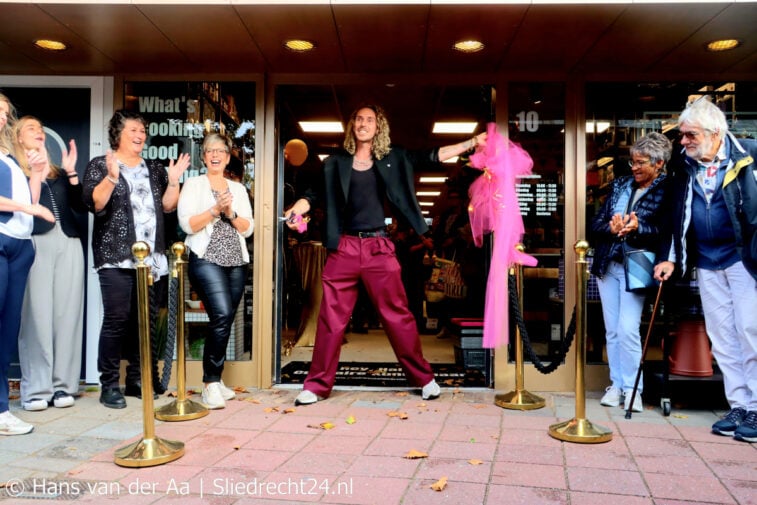 Om 12.00 uur was er een officieel moment. Exploitant Tim van der Beek (her)opent de Kookwinkel door het verwijderen van een roze lint. Applaus van familie, vrienden, medewerkers én – niet onbelangrijk – klanten neemt hij met dank in ontvangst. (Foto Hans van der Aa / Sliedrecht24)