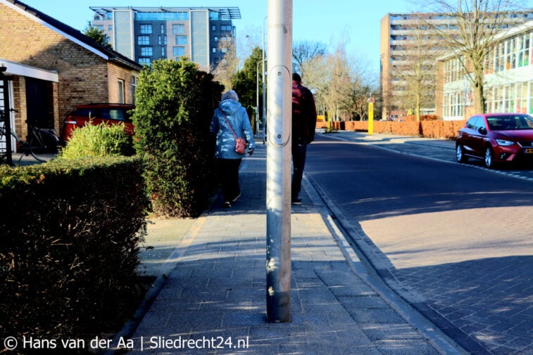Een aantal lantaarnpalen staat na de herbestrating middenop het smalle trottoir. Dat maakt het voor voetgangers niet eenvoudiger, al helemaal niet voor mensen die afhankelijk zijn van een rollator of scootmobiel. Zij kunnen er niet of nauwelijks langs. Vóór sporthal De Valk zijn haakse parkeerplaatsen aangelegd die een meter of meer langer zijn dan ‘normale’ parkeerplaatsen. Daardoor is de rijbaan ter plekke aanzienlijk smaller geworden. Opvallend is dat hier ook (nog) een lantaarnpaal midden tussen twee parkeerplaatsen staat opgesteld (zie foto hieronder), geen optimale situatie.