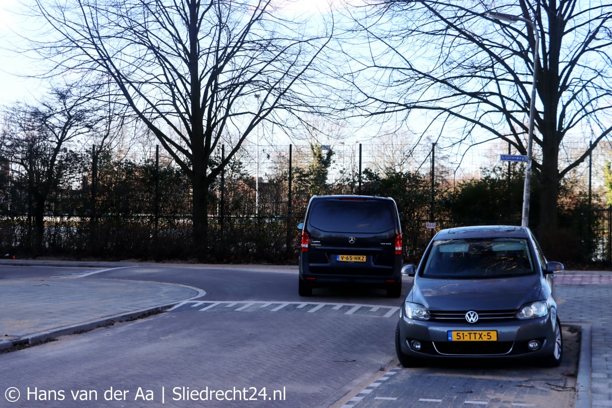 Langs de Valkweg zijn parkeerstroken en extra groenstroken aangelegd, met als gevolg dat de rijbaan aanzienlijk smaller is geworden. Tevens zijn meerdere drempels aangebracht. Twee personenauto’s kunnen elkaar daar nog met moeite passeren. Als je een vrachtwagen tegenkomt, gaat dat zeker niet. De toegepaste wegversmalling heeft ongetwijfeld mede te maken met de aanwezigheid van twee scholen, de doorstroming en uitwijkruimte worden daardoor wel belemmerd. De nieuwe situatie op de hoek van de Valkweg/Lijsterweg is nijpend, twee voertuigen kunnen daar absoluut niet tegelijk door de bocht (zie foto hieronder). Vóór de herbestrating was dat wel het geval.