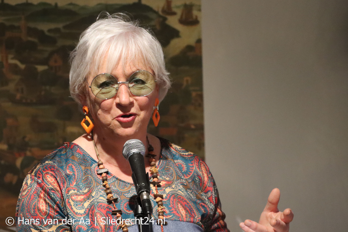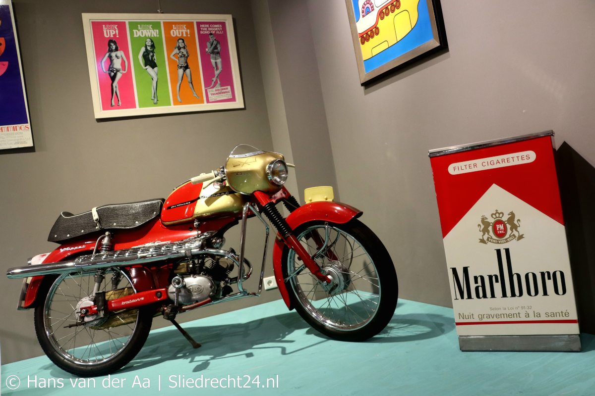 Voorzitter Astrid van Leeuwen (zie foto hieronder) – zelf uitgedost in kleding en met toepasselijke accessoires uit de 60’s – toonde zich verrukt over de nieuwe tentoonstelling: “Vele vrijwilligers hebben er de afgelopen maand hart en ziel in gestoken om er iets prachtigs van te maken. Bekijk de beelden op het grote scherm, waar belangrijke gebeurtenissen en feiten worden vertoond, beleef de protesten die in die jaren veelvuldig werden gehouden. Waan je in je jeugdjaren, met de iconische brommers, de ‘buikschuivers’ (in het museum staan fraaie exemplaren van de Puch MV 50 en de Batavus Whippet – red.), de boeken en platen. Lees de artikelen uit De Merwestreek van die jaren.” Van Leeuwen bedankte een aantal mensen, die hun kostbare spullen belangeloos in bruikleen hebben gegeven.