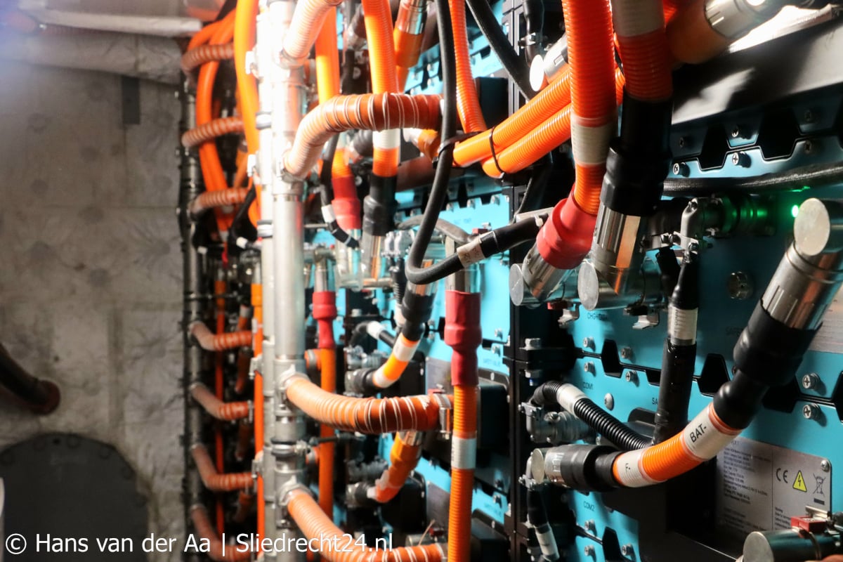Het bestaande kraanschip ‘Prins 6’ is getransformeerd naar Zero Emission (Prins ‘ZEs’, ‘ZE’ staat voor ‘Zero Emission’, toepasselijk ‘hergebruik’ van het cijfer 6 – red.). Het schip werkt niet alleen met een elektrische kraan, maar vaart ook op batterijen (zie foto hieronder). Het schip wordt opgeladen door omzetting van waterstof in elektriciteit zonder verbranding. Als de accu’s helemaal leeg zijn kunnen deze met het waterstofcelaggregaat in twaalf uur volledig worden opgeladen, waarna de Prins ZEs een hele werkdag elektrisch kan varen én werken.