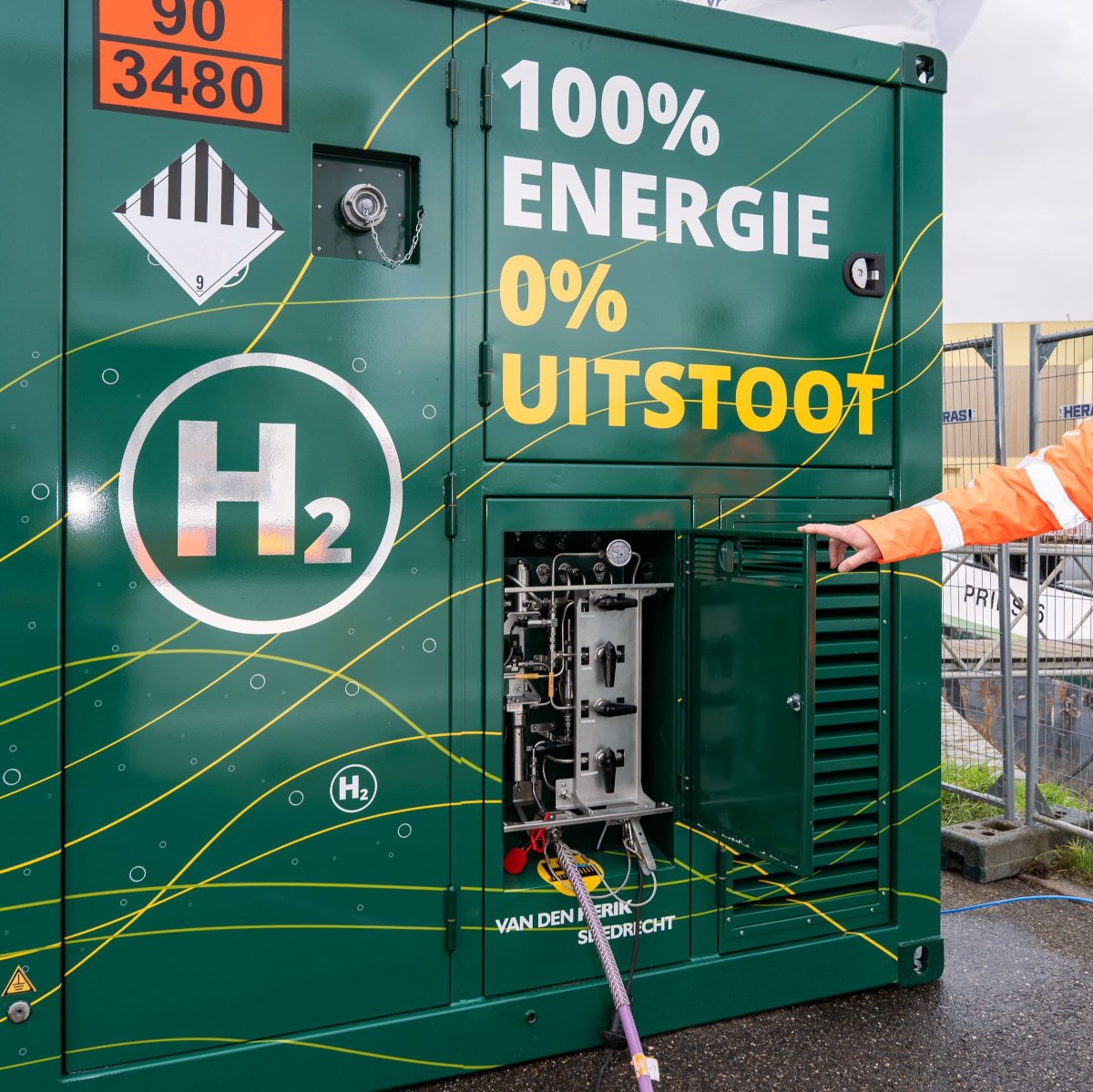 Omdat er nog geen netwerk van laadpunten langs de vaarwegen aanwezig is, heeft Van den Herik in eigen beheer een compact 10-voets waterstofcelaggregaat ontwikkeld. Ondanks het formaat is dit echt een Powerhouse; in staat om maar liefst 3.600kWh (!) per dag aan stroom te genereren en te leveren. Het waterstofcelaggregaat (zie foto hieronder) is op de wal geplaatst met daarnaast een trailer met onder hoge druk (max. 381 bar) opgeslagen waterstof. Vervolgens gaat de waterstof de brandstofcel in, zet dit om in elektriciteit en levert die aan de accu’s aan boord van het schip.