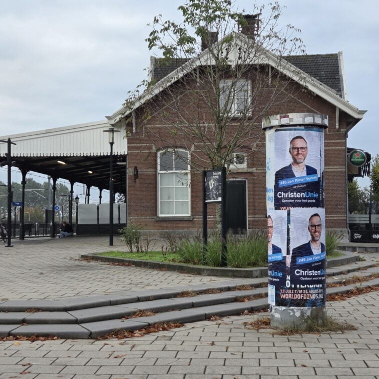 Jan Pieter Verweij is regiokandidaat voor de ChristenUnie en wil kiezers aan hem binden. Deze zuil is beplakt bij het station in Sliedrecht. (Aangeleverde foto)